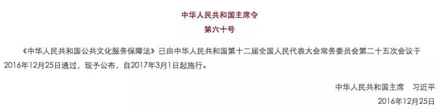 12月25日,十二届全国人大常委会第二十五次会议高票通过了《中华人民共和国公共文化服务保障法》(以下简称《保障法》),明确了政府在公共文化领域的保障责任,对于促进基本公共文化服务标准化、均等化、保障公民基本文化权益具有十分重要的意义。《保障法》的出台,不仅是现代国家治理在文化领域的具体体现,而且对于促进文化领域的法治建设具有重要的里程碑意义,突出体现在: